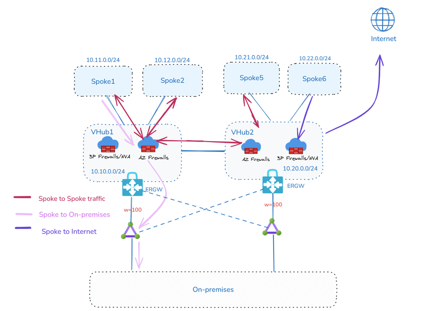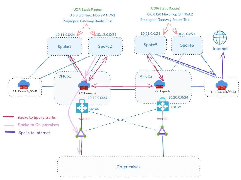 **注意:** _虽然第三方防火墙 VNet 不需要连接到 VHub 以实现流量流,但这样做有助于管理便利和本地环境可达性。_