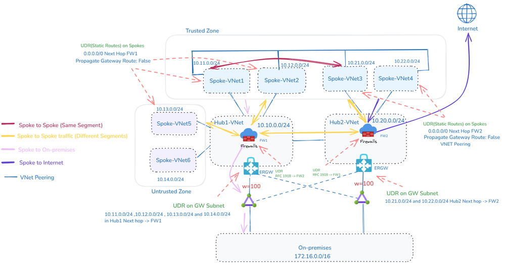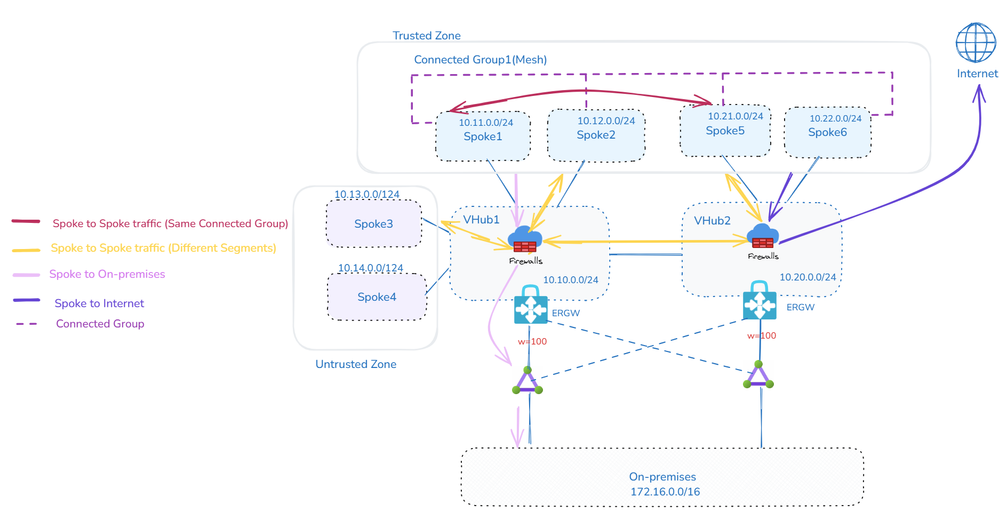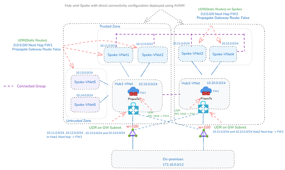 在此设计中,VNet 被分组到受信任和不受信任区域。受信任 VNet 可以存在于同一 Hub 或不同 Hub 中。要绕过受信任 VNet 之间的检查,您可以使用 VNet 对等互连或 AVNM Mesh 连接性拓扑直接连接它们。