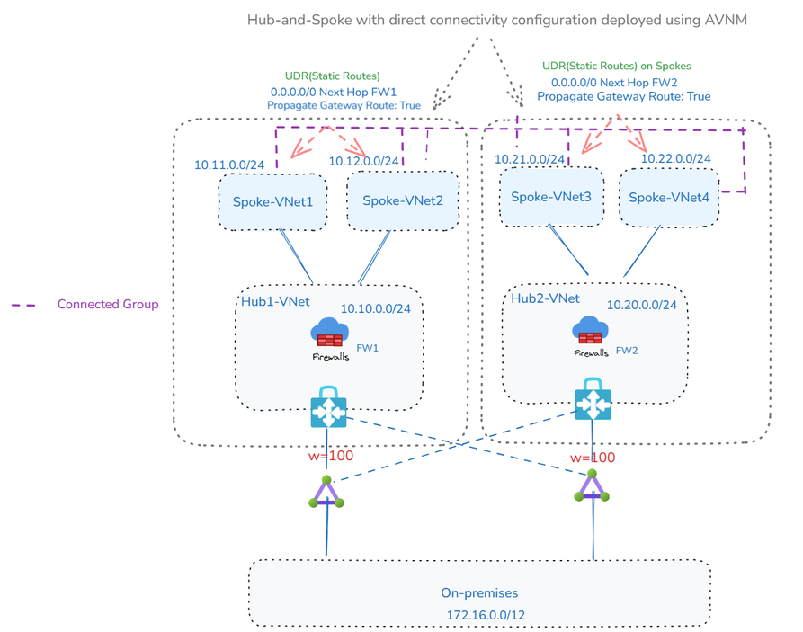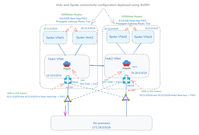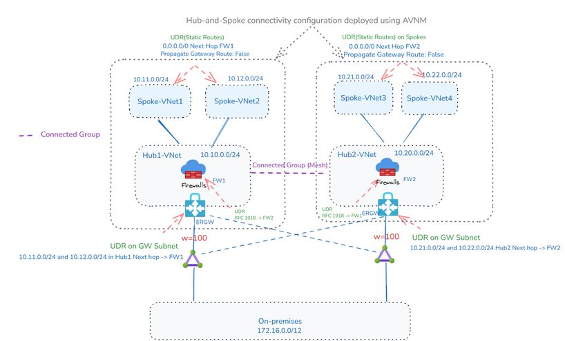 - AVNM 还启用集中创建、分配和管理 UDRs,从而简化大规模网络配置。
