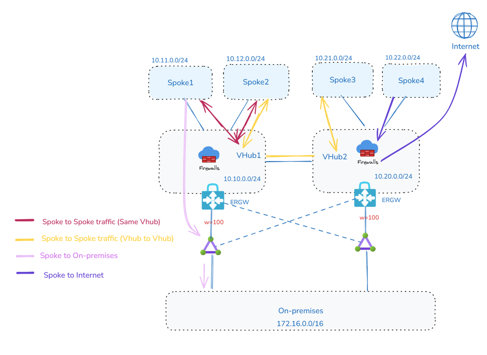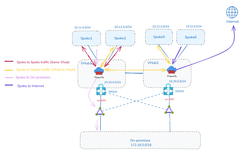 在所有场景中,基础架构假设有两个虚拟 Hub (VHub),每个 VHub 连接到其各自的本地 Spoke VNet。vWAN 提供两个 VHub 之间的默认连接性,每个 VHub 还连接到本地和远程 ExpressRoute 电路以实现冗余。