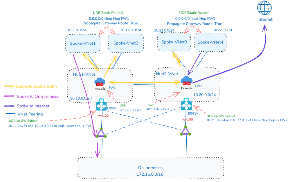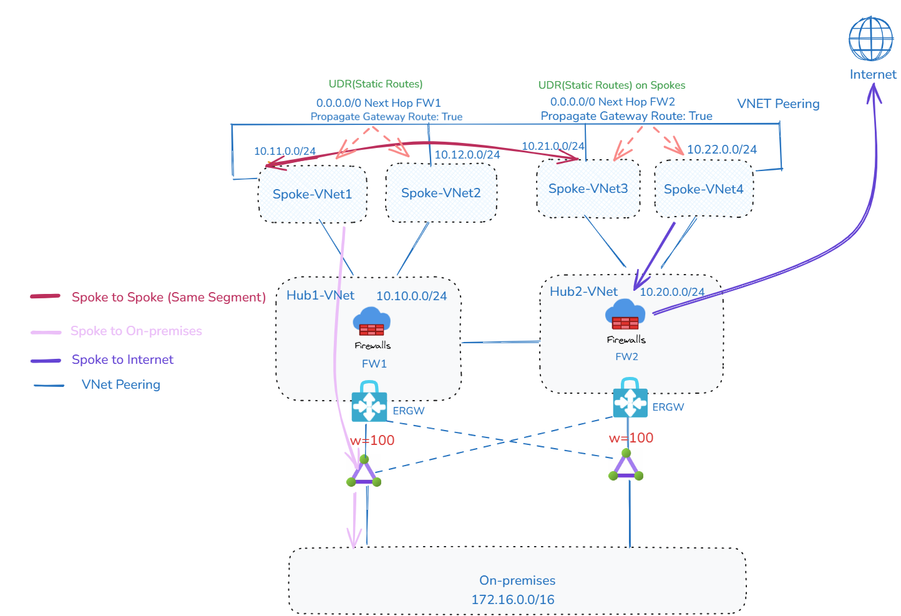 - VNet 对等互连用于连接每个 Spoke 到其本地 Hub,以及在两个 Hub 之间建立连接。